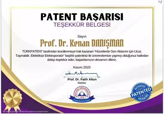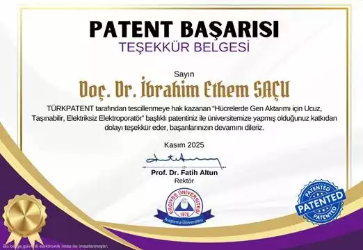 Bölümümüz öğretim üyelerinden Prof. Dr. Kenan DANIŞMAN ve Doç. Dr. İbrahim Ethem SAÇU tarafından tescillenmeye hak kazanan "Hücrelerde Gen Aktarımı için Ucuz, Taşınabilir, Elektriksiz Elektroporatör" başlıklı patent çalışması ile Üniversitemize yapmış olduğu katkılardan dolayı;