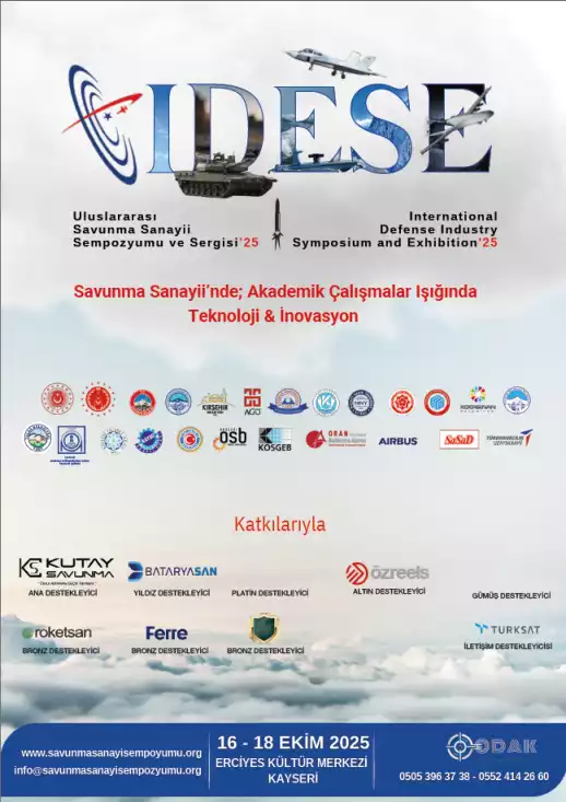 16-18 Ekim 2025 tarihleri aralığında Erciyes Kültür Merkezinde ULUSLARARASI SAVUNMA SANAYİİ SEMPOZYUMU ve SERGİSİ'25 düzenlenecektir.