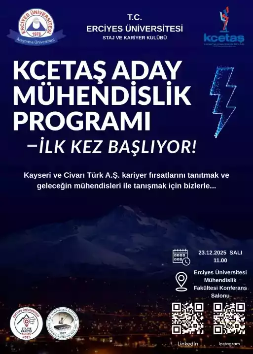 KCETAŞ Aday Mühendislik Programı Yazılı Sınavı 3 Şubat 2026 Salı günü saat 10.00'da Elektrik-Elektronik Mühendisliği Bölümü A1005 nolu sınıfta yapılacaktır.