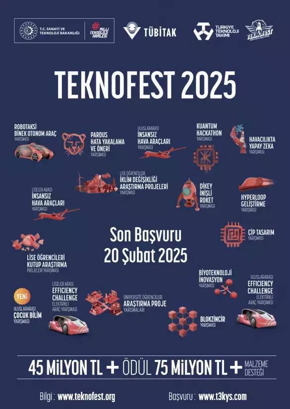 TEKNOFEST 2025 hakkında detaylı bilgi www.teknofest.org sayfasından duyurulmakta, başvurular 20 Şubat 2025 tarihine kadar www.t3kys.com sisteminden alınmaktadır.